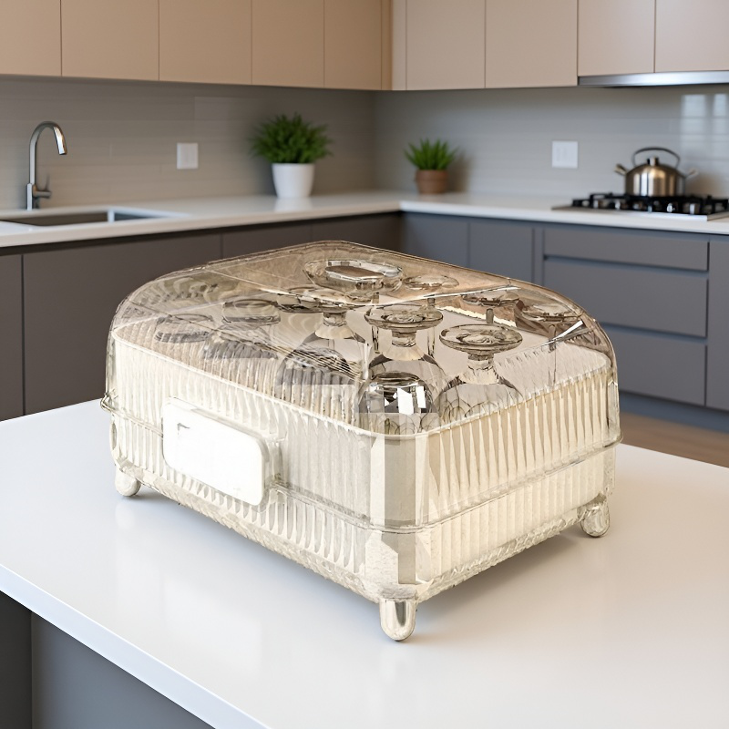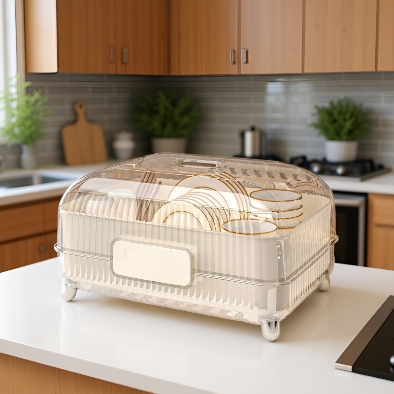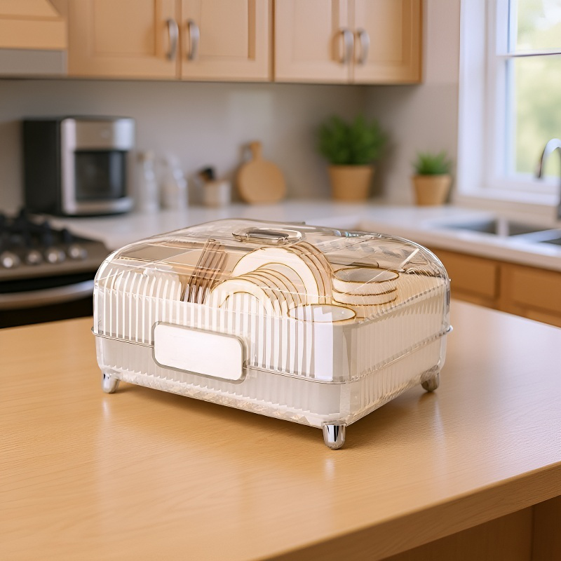 라이트 럭셔리 주방 물빠짐 그릇 선반 대용량 수납함 방진 뚜껑 달린 탁상 그릇 수납 정리기